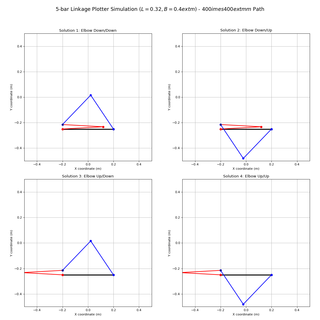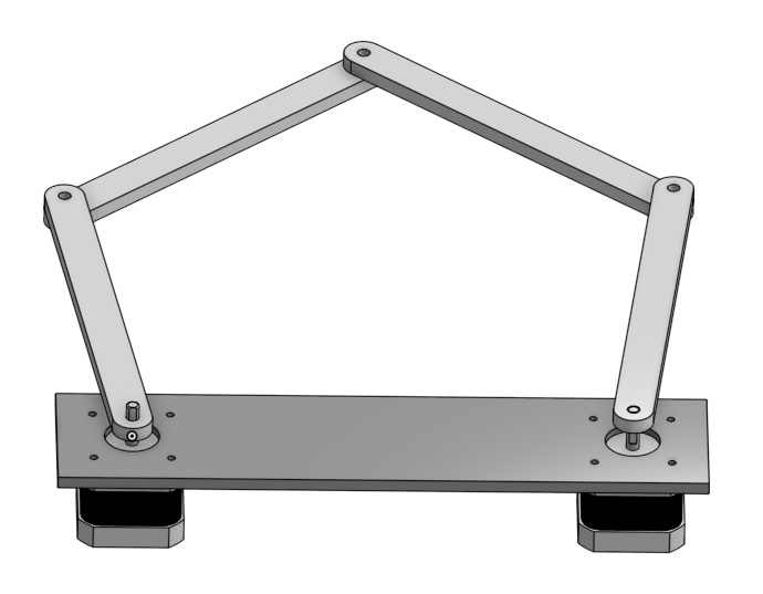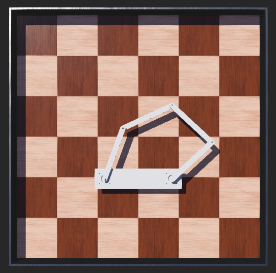 webots_ik_right_top_corner.py 執行控制後機構模擬如下,之後可以修改此一程式透過 t1_ik(x, y) 與 t2_ik(x, y) 求得 plotter 繪圖點座標設置為繪圖區各點時的 t1 與 t2 馬達旋轉角度,其量測參考線為馬達右側的水平線作為起點,且逆時針方向為正。