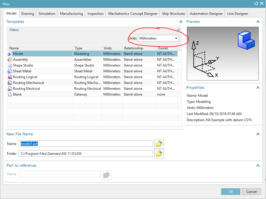 - Create a new model file from “New”. Note that the “Units” is specified in this dialog.